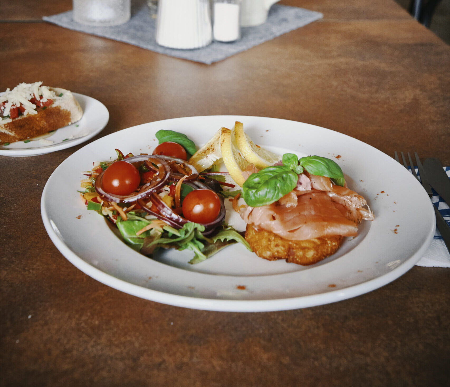 Scheiben vom schottischen Lachs auf warmen Kartoffelröstis mit Preiselbeer Meerrettich an buntem Gartensalat und Bruschetta