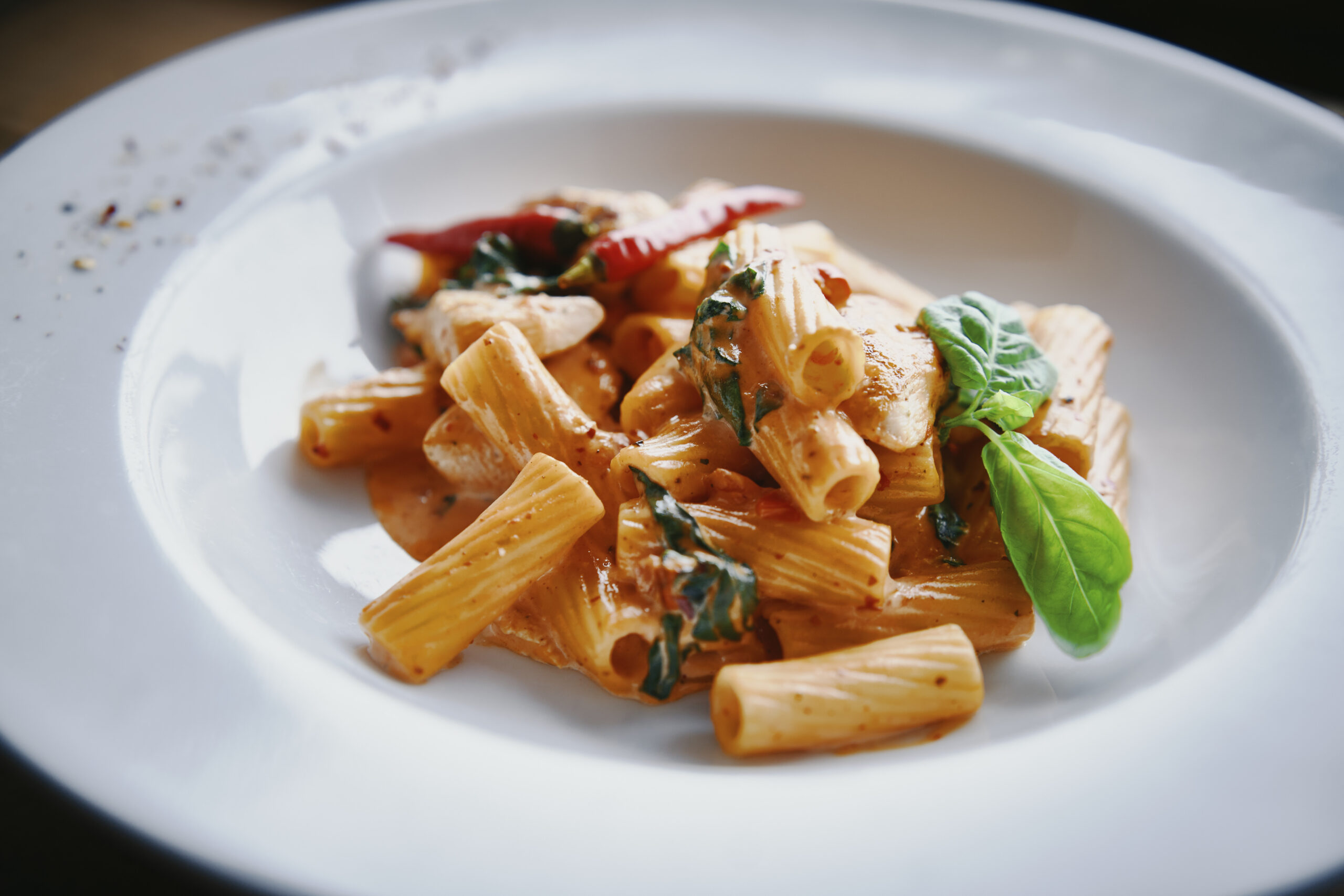Rigatoni in feiner pikanter Chili Sahnesauce mit gegrillten Streifen vom Hähnchenbrustfilet und frischen Blattspinat